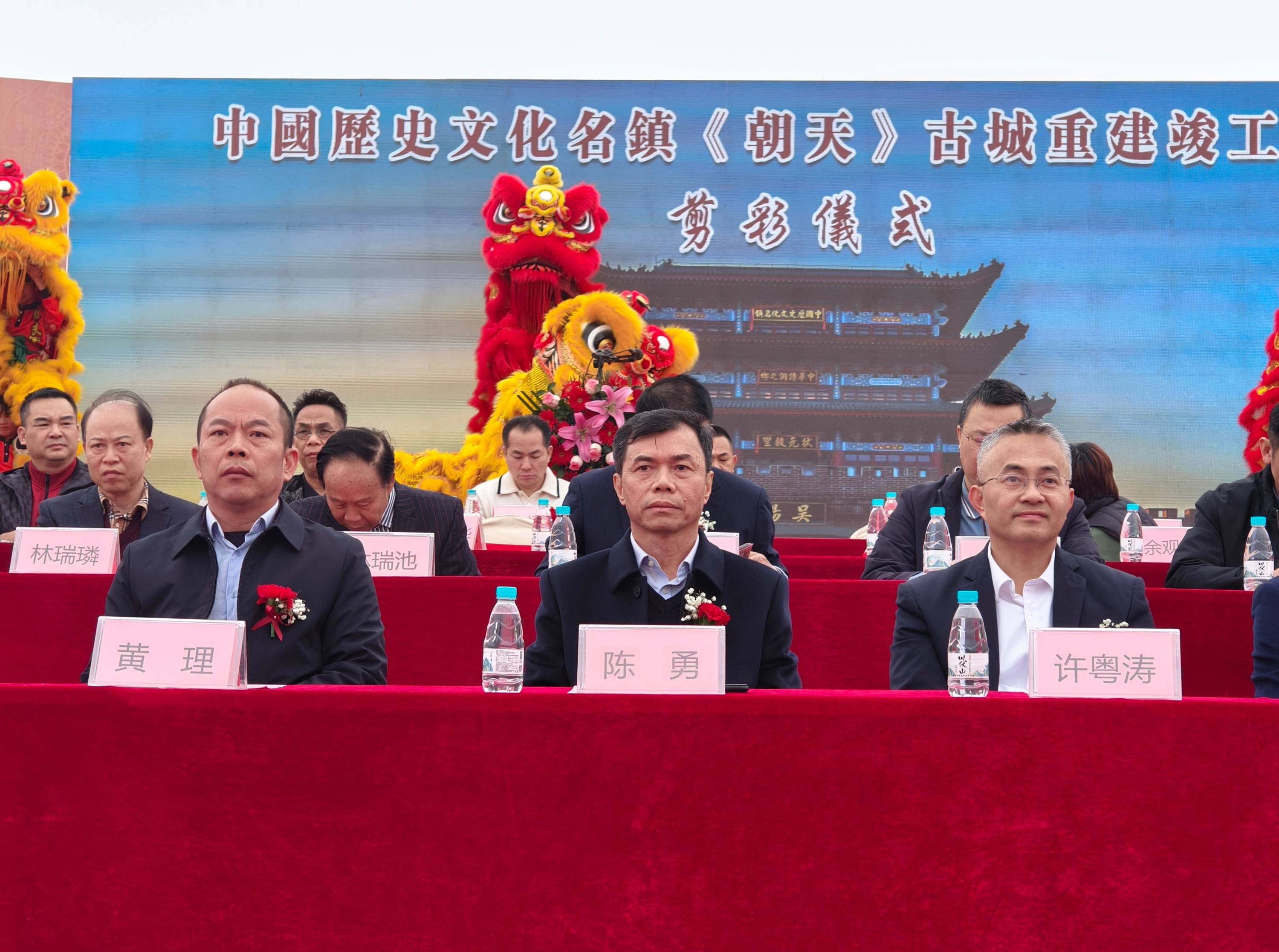吴川市人大常委会党组书记、主任陈勇,吴川市副市长许粤涛,吴川市副市长、市公安局局长黄理,吴阳镇党委书记钟飘祥,深圳市宇马房地产开发有限公司董事长、吴阳镇历史文化名镇发展促进会会长林瑞涛,深圳市理想时代集团有限公司董事长、吴阳镇历史文化名镇发展促进会执行会长吴日松,广东永晟建设集团有限公司董事长、吴川市吴阳镇历史文化名镇发展促进会常务副会长文华盛,施工与设计代表、浙江大学博士黄俊等领导嘉宾出席竣工仪式,并共同为古城楼“朝天门”剪彩。